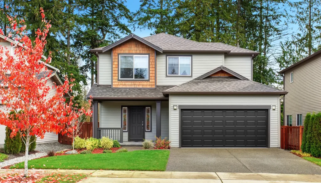 Clopay の Classic Steel コレクションは「伝統的なレイズドパネル(立体パネル)デザイン」を特徴としており、住宅の顔となるガレージシャッターに落ち着きと格を与えます。